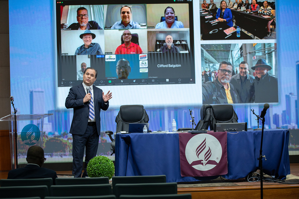 Pastor Dennis Slusher, president of the Belize Union, leads the morning devotional during institutional board meetings, emphasizing reliance on the Holy Spirit for mission growth. [Photo: Keila Trejo/IAD]
