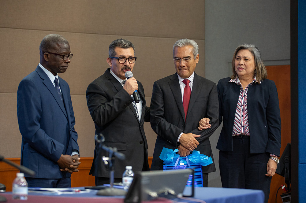 AD President Pastor Abner De los Santos pays tribute to Moisés Reyna and his wife, Thelma, on Nov. 10, 2025, for their years of dedicated service to GEMA Editores and the church in Mexico as they retire from active ministry. [Photo: Keila Trejo/IAD]