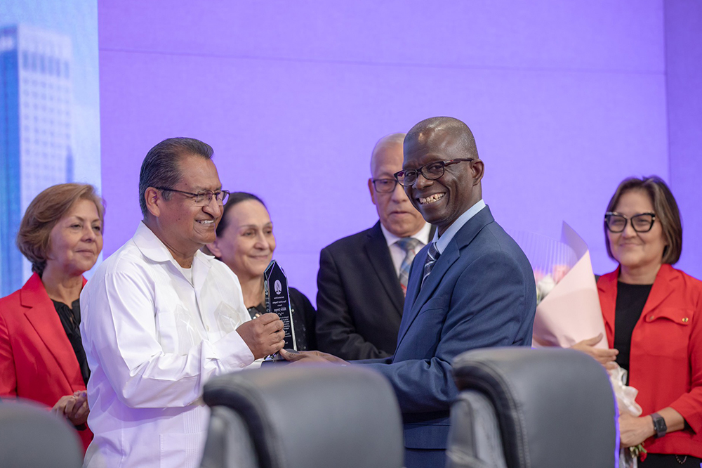 IAD Executive Secretary Pastor Pierre Caporal (right) presents a Legacy of Service Award to Pastor Melchor Ferreyra (left), former Personal Ministries director of the IAD, during the recognition ceremony on Nov. 13, 2025, honoring longtime leaders for their faithful ministry across Inter-America. [Photo: Keila Trejo/IAD]