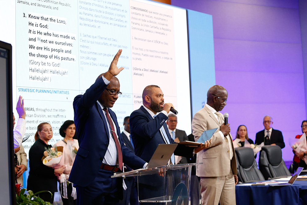 “We hereby submit ourselves to the power of the Holy Spirit to return to our respective fields to live and breathe the mission and the strategic mandate in every home, every street, every village, every town and city, and every country…. We acknowledge God’s leading in the Inter-American Division, and we repose in Him all the praise, honor, glory and majesty which He deserves; we offer ourselves anew for consecration and remain passionate and available to His service as we live the Mission.”