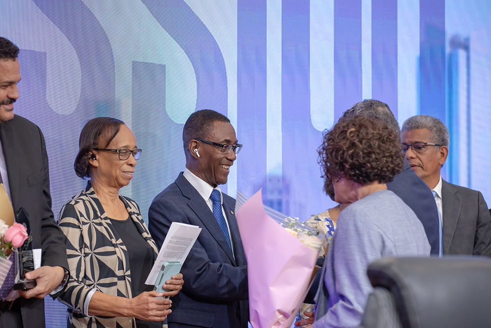 IAD Treasurer Ivelisse Herrera presents flowers and a Legacy of Service Award to Ketly Henry for more than 20 years of dedicated service at the IAD office, as Pastor Elie Henry, former IAD president, shares a light moment with fellow honorees during a special recognition ceremony at the close of Annual Council on Nov. 13, 2025. [Photo: Keila Trejo/IAD]