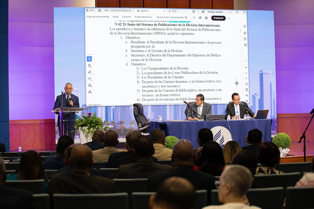 Pastor Isaias Espinoza, publishing ministries director of the IAD, presents updates to the Publishing Ministries policies before executive committee members vote on them on Nov. 13, 2025. [Photo: Keila Trejo/IAD]