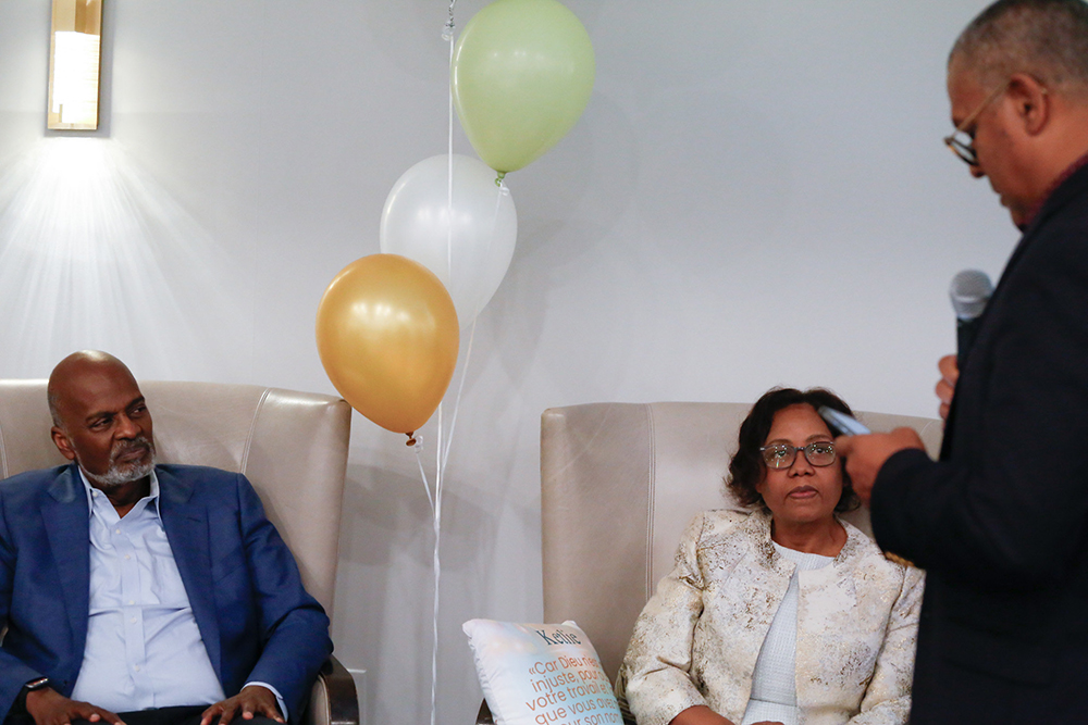 Pastor Elie and Ketlie Henry smile as they watch a special video tribute played in their honor during the farewell ceremony on Nov. 9, 2025.[Photo: iadmedia]