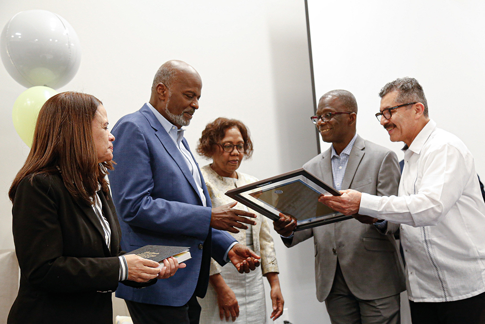 IAD administrators honor former president Pastor Elie Henry and his wife, Ketlie, as Pastor Abner De los Santos (right) and Executive Secretary Pierre Caporal (second from right) present a special plaque, while Treasurer Ivelisse Herrera (left) looks on with a smile. [Photo: iadmedia]