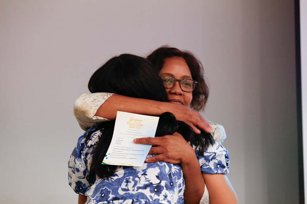 Ketly Henry is embraced by Orpha de la Cruz of the Dominican Union, who spoke on behalf of union administrators’ wives to honor Henry’s empathy, prayerful spirit, and constant encouragement to ministry families.[Photo: iadmedia]