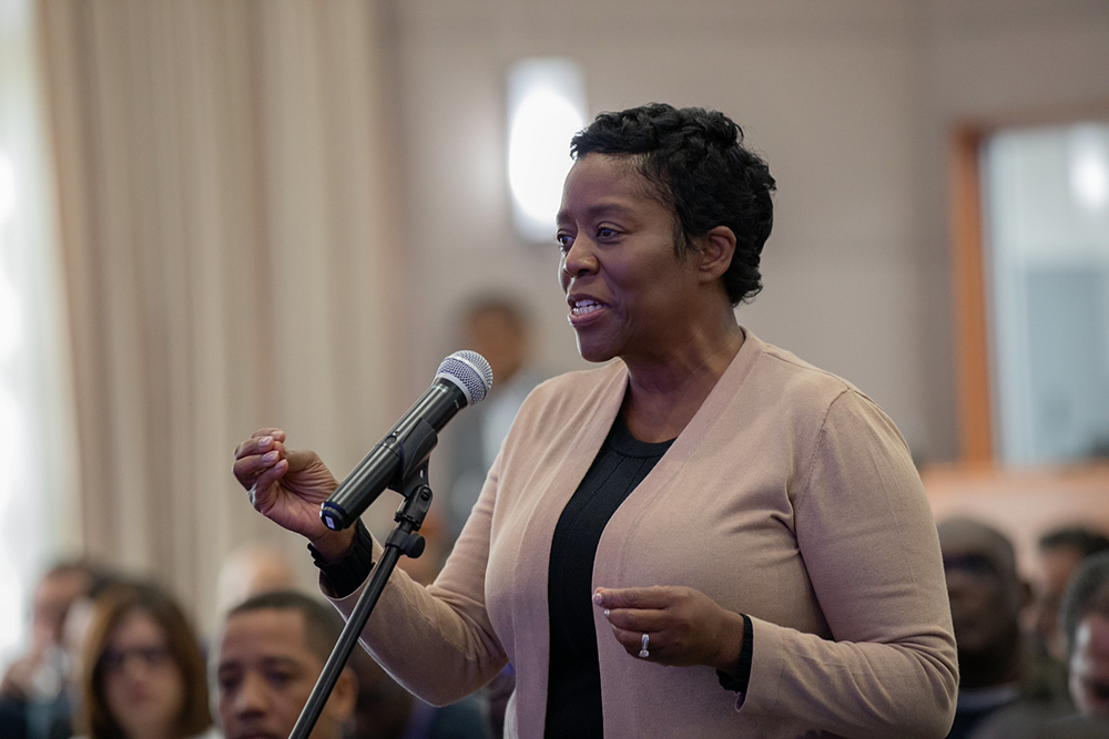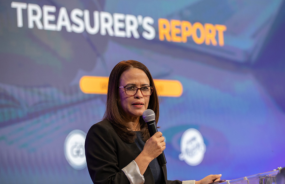 Sabrina DeSouza, associate treasurer of the General Conference, speaks at the microphone to express appreciation for the Inter-American Division’s strong financial leadership. [Photo: Keila Trejo/IAD]