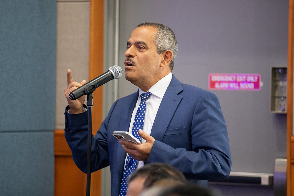 A committee member takes a photo during the treasurer’s report. [Photo: Keila Trejo/IAD]