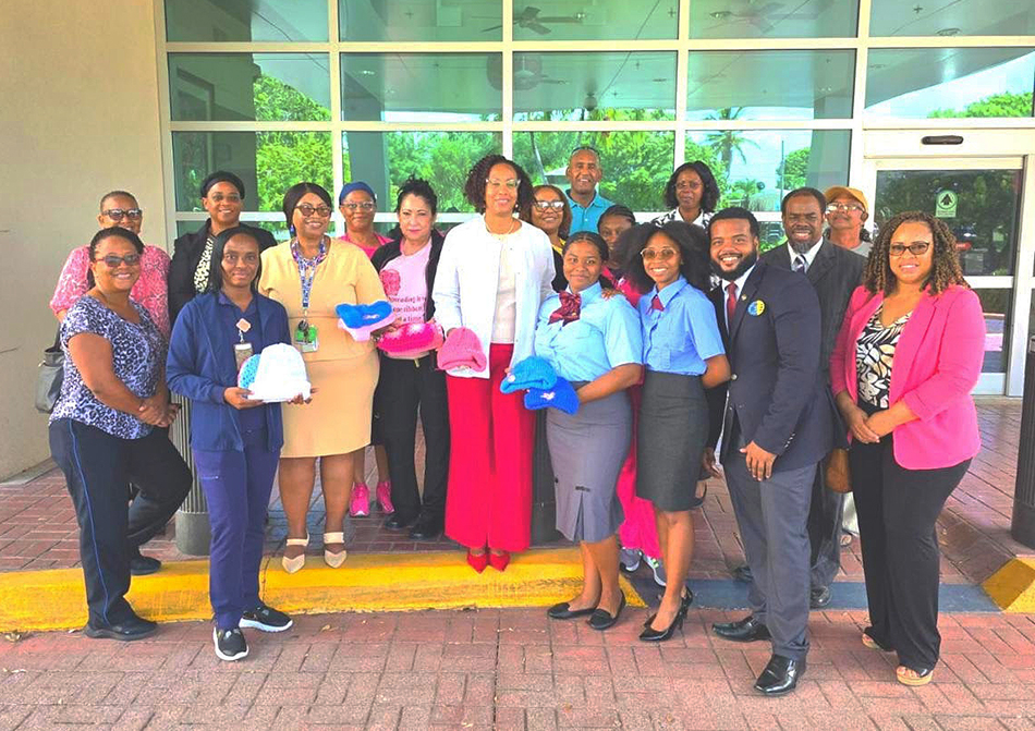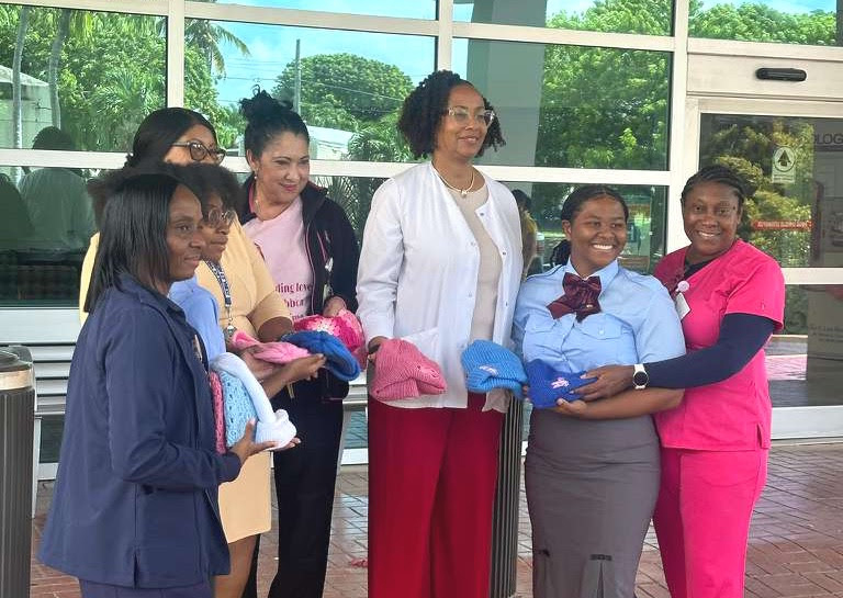 Leanna Carr (third from right, front) joins hospital staff, church leaders, and family members during the presentation of handmade crochet hats at the Governor Juan Luis Hospital in St. Croix. [Photo: North Caribbean Conference ]