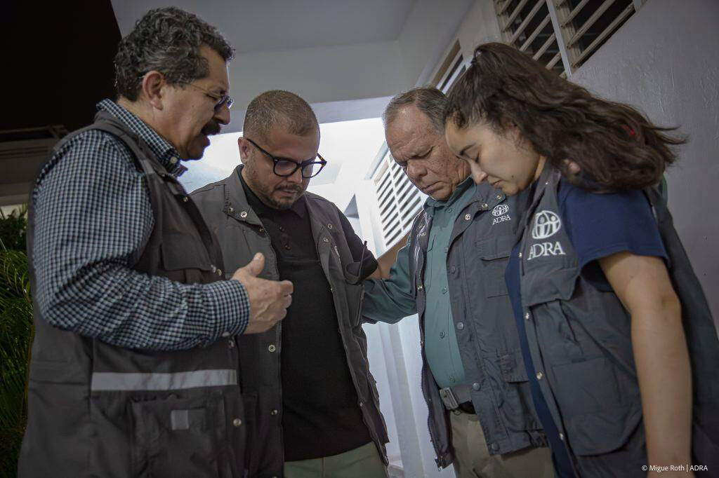 Rubén Ponce (second from left), who served as ADRA’s Emergency Response Team manager in Jamaica following the aftermath of Hurricane Melissa, and Alejandra López, ADRA ERT program manager (right), are prayed for by IAD President Pastor Abner De los Santos (left) and David Poloche during a visit to Mandeville, Jamaica, on Nov. 2, 2025.