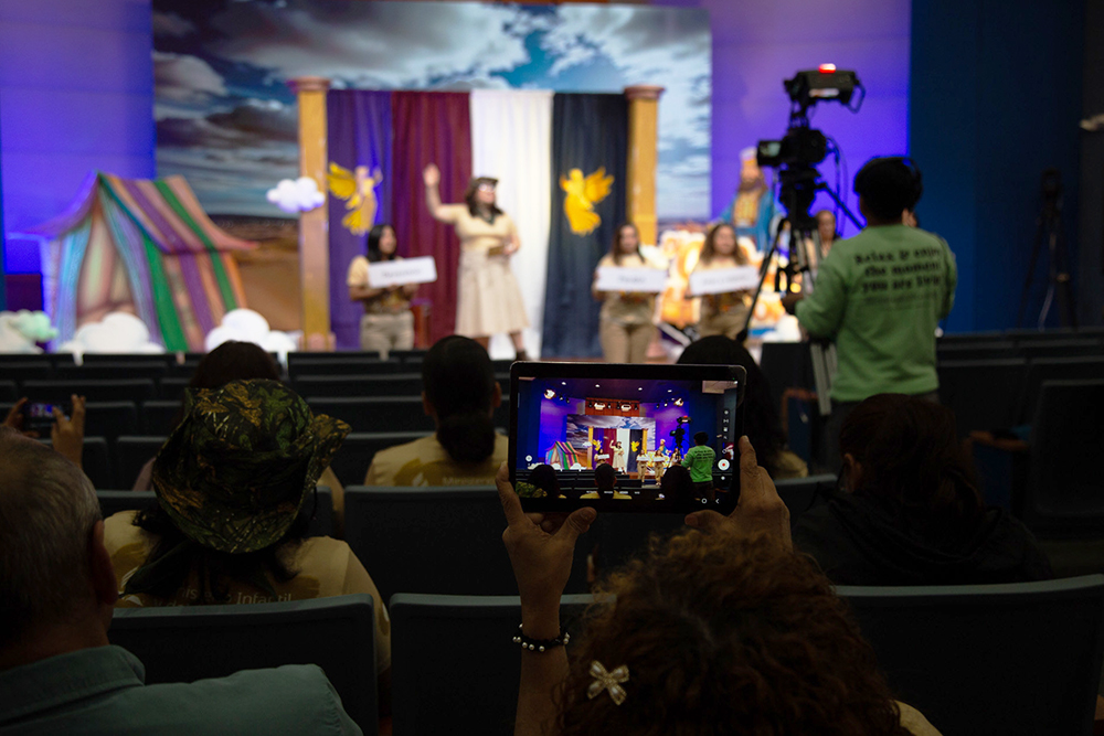 A children and adolescent ministries leader records the live Vacation Bible Experience training program on an iPad inside the Inter-American Division auditorium on Feb. 10, 2026. [Photo: Libna Stevens/IAD]