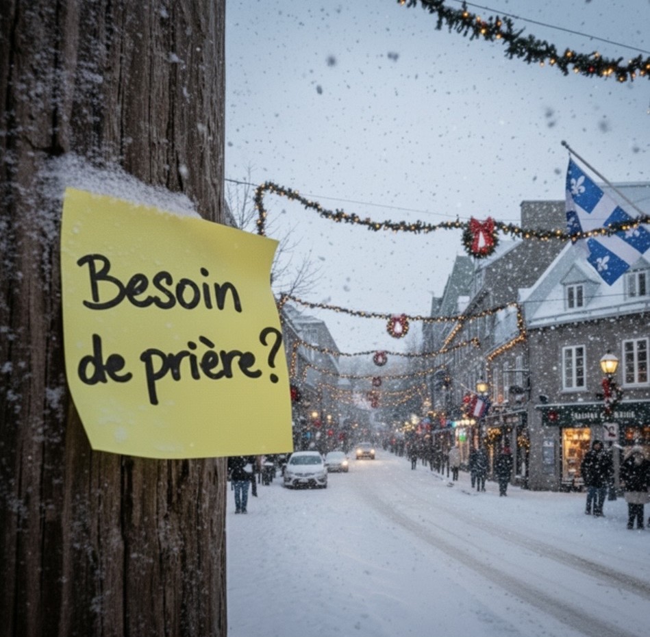 Targeted social media ads include AI-generated images of places well known to Quebeckers and a sticky note with an invitation to be prayed for. [Image: Espoir Média Québec and Il Est Écrit]