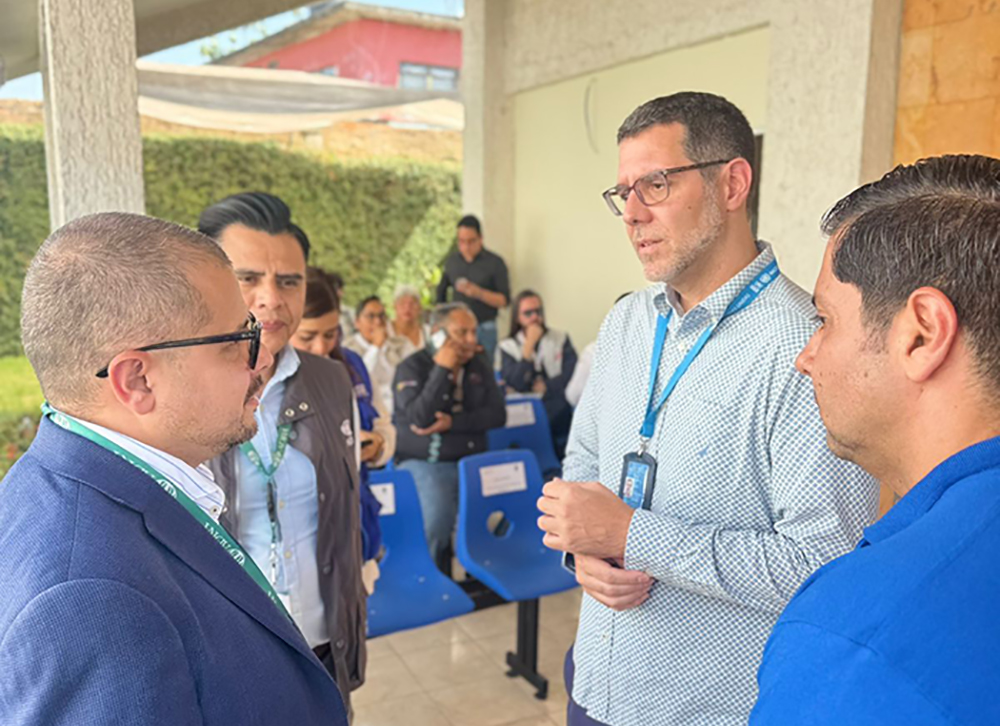 Rubén Ponce (left), ADRA Inter-America director, speaks with Gustavo Guiveia (third from left), ACNUR official in Chiapas, and Luis Miguel Carvajal (right), property official, while Raúl Villafán (second from left), ADRA Mexico director, discusses the humanitarian situation along Mexico’s southern border in Chiapas. [Photo: ADRA Mexico]