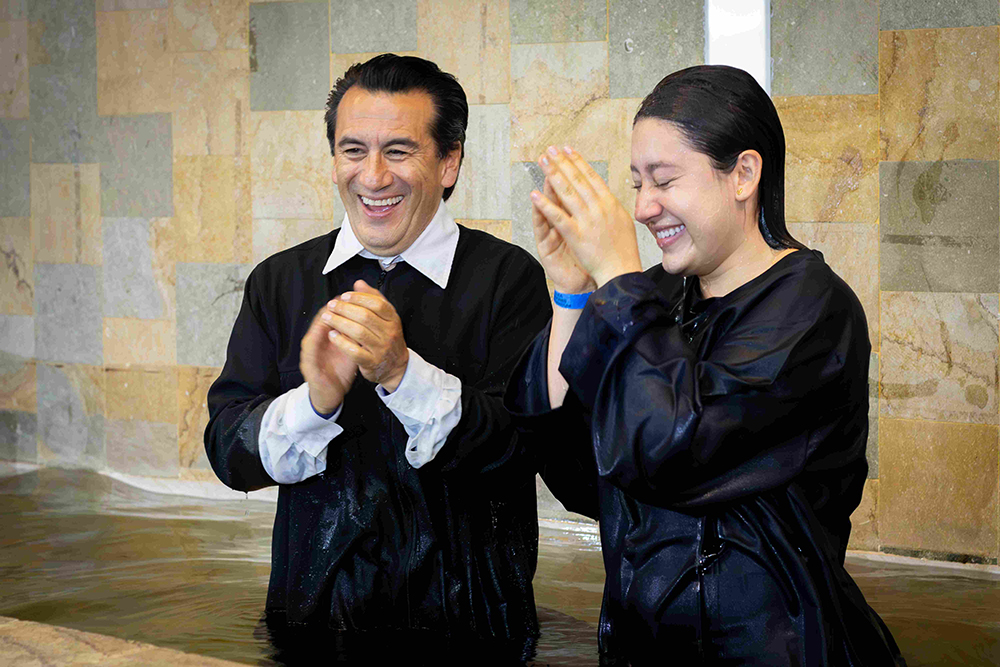 Michelle Pulido celebrates her baptism with Pastor Leonel Preciado, guest speaker at the National Literature Evangelists Assembly, during an emotional ceremony highlighting the life-changing impact of student literature evangelism. [Photo: UCN Communication]