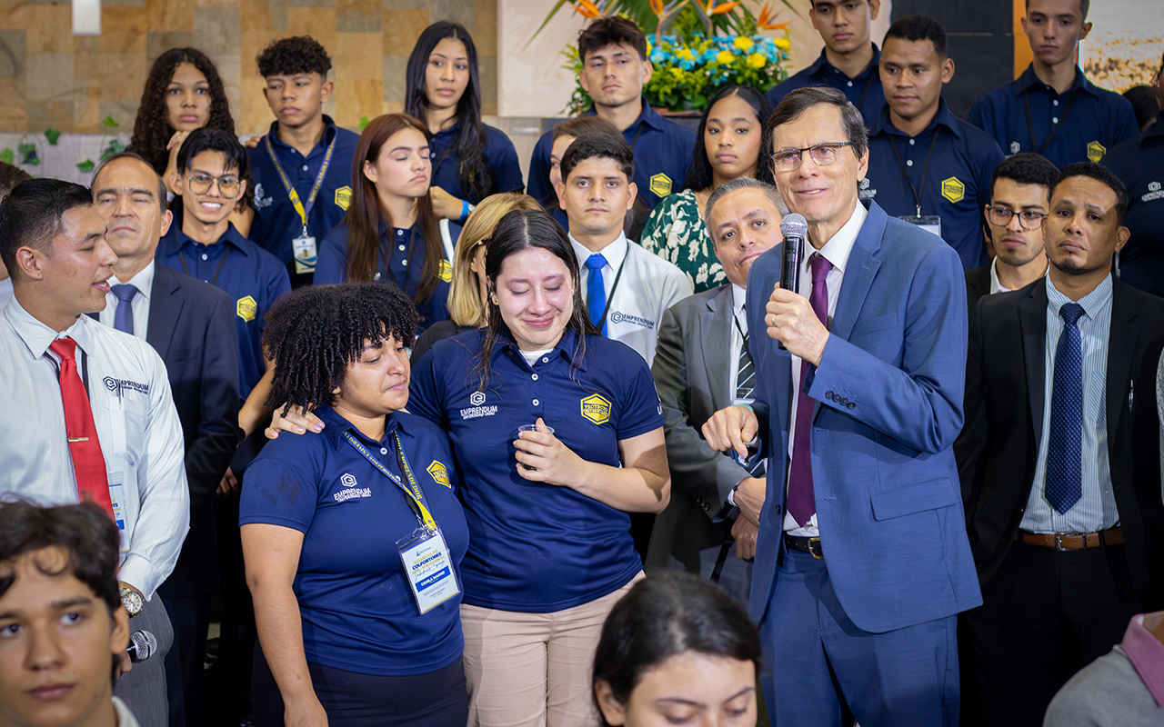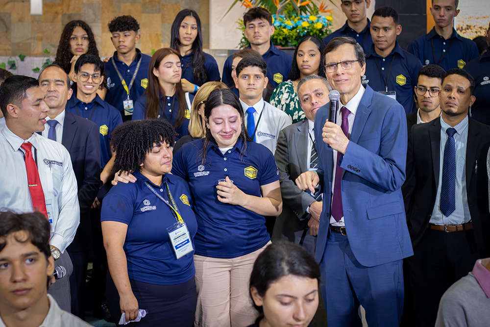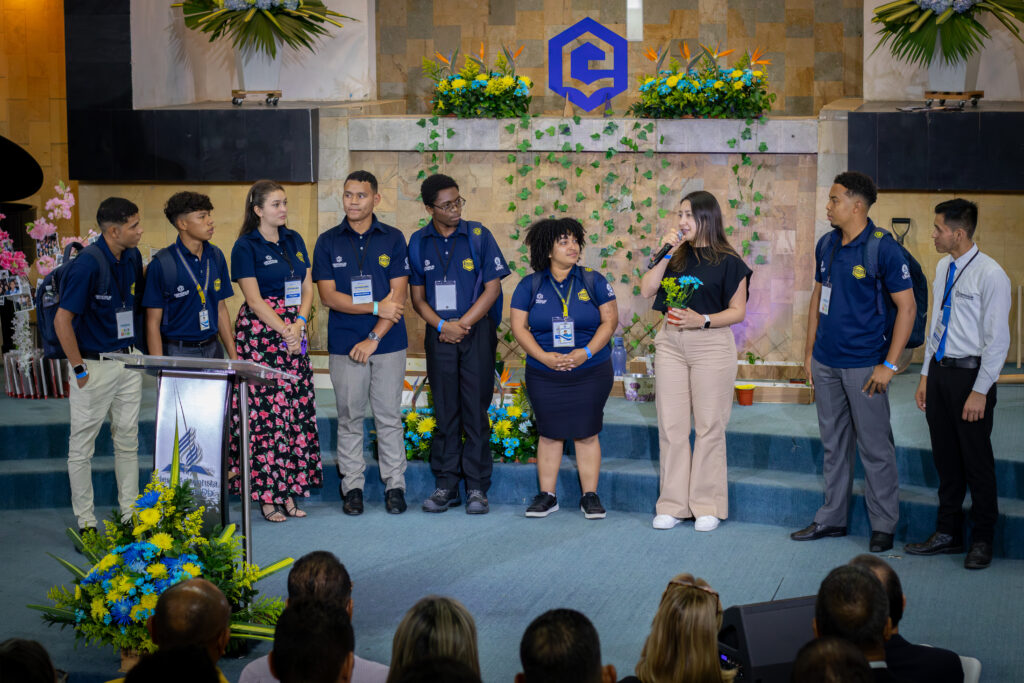 Pastor Mario Martinelli, Publishing Ministries director of the General Conference, addresses student literature evangelists during the National Assembly as Michelle Pulido and the team who supported her spiritual journey stand on stage following her baptism. [Photo: UCN Communication]