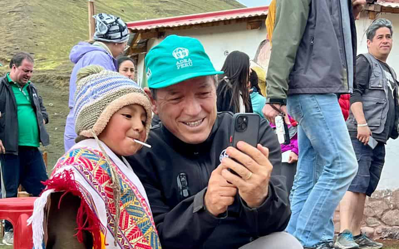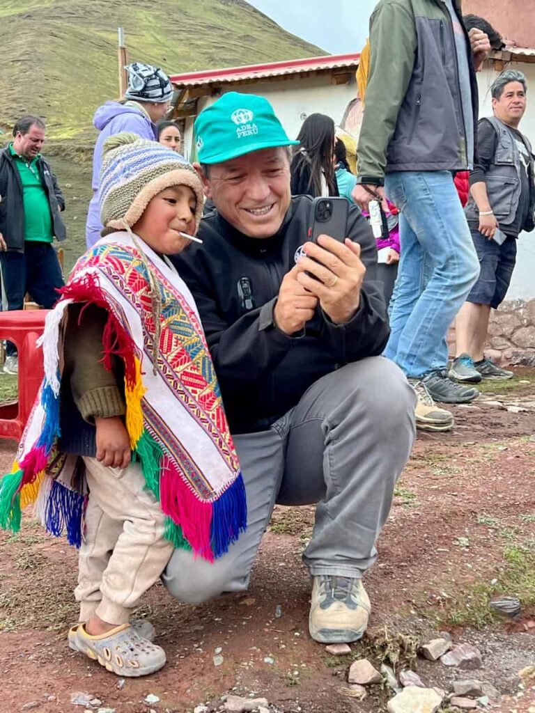Paulo Lopes talks to a young child during a 2023 ADRA Connections trip in Peru. [Photo: ADRA International]