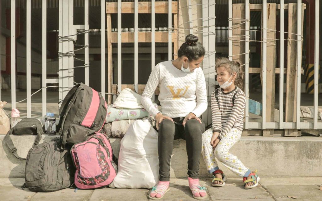 A mother and daughter sit together on a rail in Colombia. [Photo: “Strangers Among Us]
