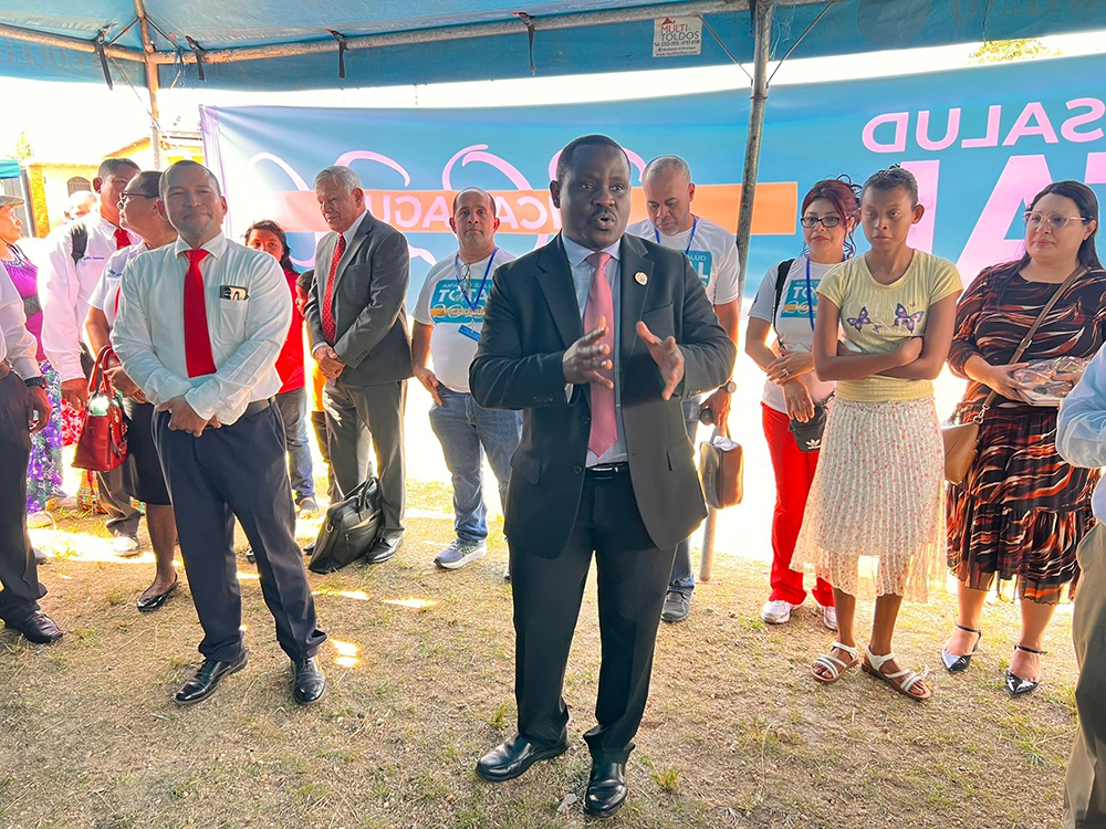 Franck Géneus, M.D., health ministries director of the Inter-American Division, speaks during a health outreach in Puerto Cabezas, Nicaragua, on April 11, 2026, while church leaders stand behind him. More than 5,000 people were served during the outreach. [Photo: Nicaragua Union]