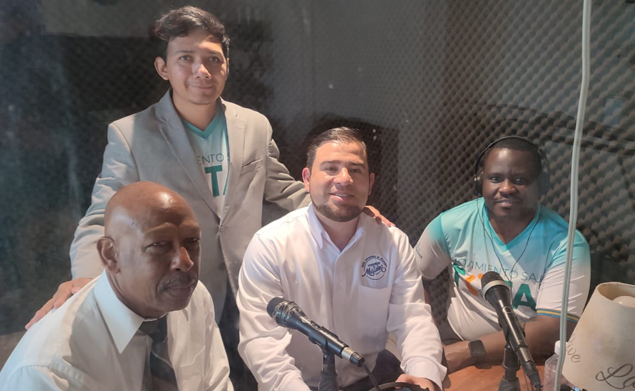 Left to Right: From left to right: Roy Forbes, Adventist Radio director in Puerto Cabezas; Adriel Vega, operational coordinator of the Health-Promoting University program at Montemorelos University; Héctor Alvarado, Nicaragua Union treasurer; and Franck Géneus, M.D., IAD health ministries director, share about the Total Health Movement in a recording studio, broadcasting in Spanish, English, and Miskito. [Photo: Nicaragua Union]