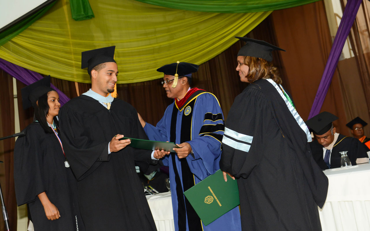 El doctor Feliberto Martínez (al centro), rector de la Universidad Adventista Dominicana, entrega el diploma al graduando Franklin Rosa Restituyo, quien obtuvo el mejor promedio.