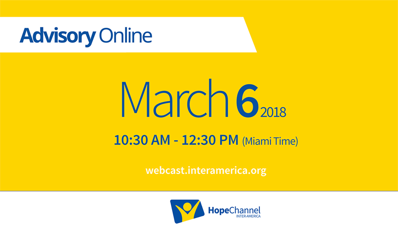Una sesión consultiva especial de Hope Channel Interamérica, de dos horas de duración, se llevará a cabo el martes 6 de marzo, en la sede central de la División Interamericana (DIA) de la Iglesia Adventista del Séptimo Día, en Miami, Florida. Este evento, transmitido en vivo a través de la red, estará dirigido mayormente a los directores de comunicación y coordinadores del canal, tanto de las uniones, como regionales, así como al personal de los 18 centros de producción mediática en todo el territorio de la DIA.