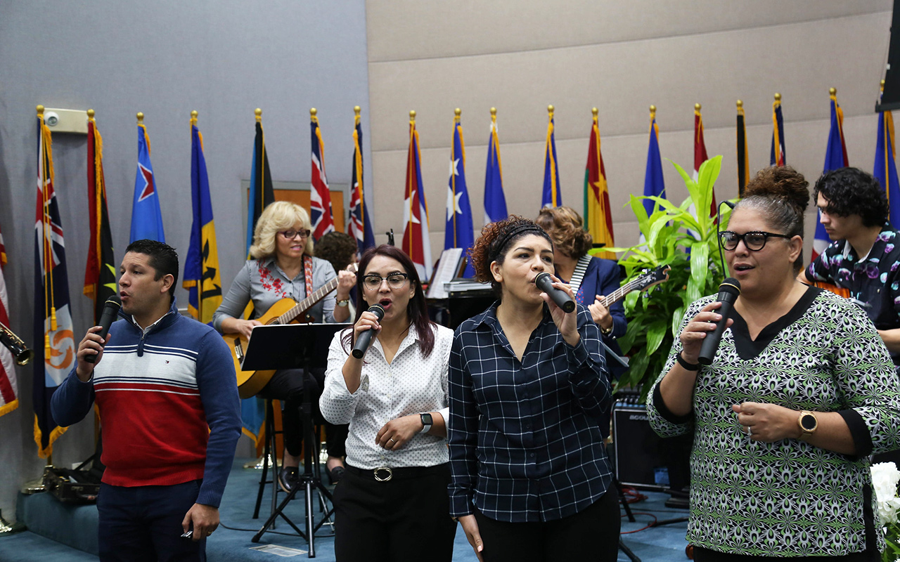 Los empleados dirigen las alabanzas y la adoración durante el culto devocional de la mañana en la Semana de Énfasis Espiritual de la División Interamericana, en Miami, Florida, Estados Unidos, el 18 de junio de 2019. Fotografía de Libna Stevens/DIA
