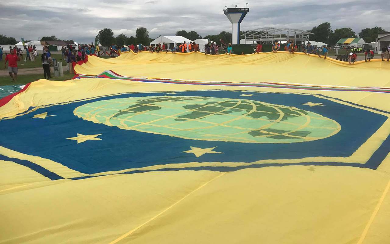 Vista parcial del inmenso pañuelo, en momentos en que voluntarios de Conquistadores ayudan a desenrollarlo en Oshkosh, Wisconsin, Estados Unidos, el 12 de agosto de 2019. Fotografía: Costin Jordache