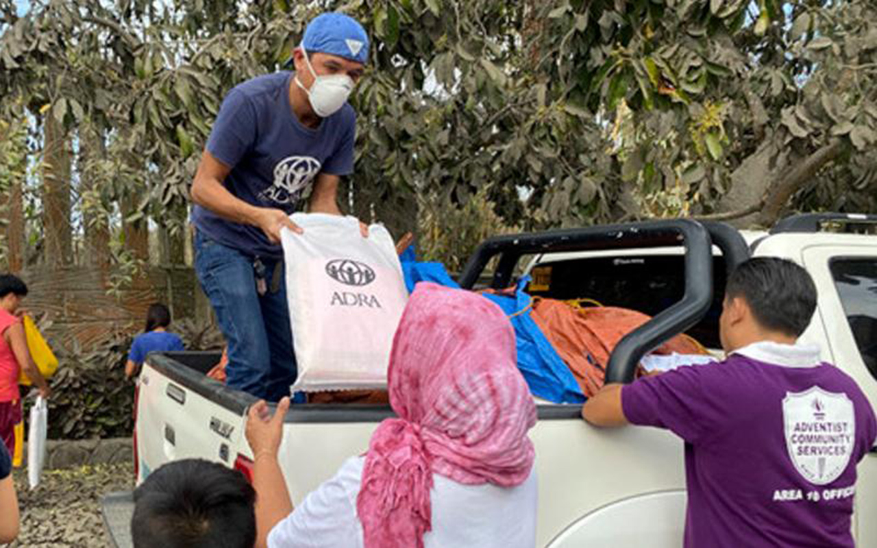 Personal ADRA en Filipinas y voluntarios de respuesta en caso de emergencia, de la comunidad adventista local, se reúnen para una fotografía de grupo al asistir a personas forzadas a salir de sus casas por causa de la erupción del volcán Taal. [Imagen: ADRA Canada]