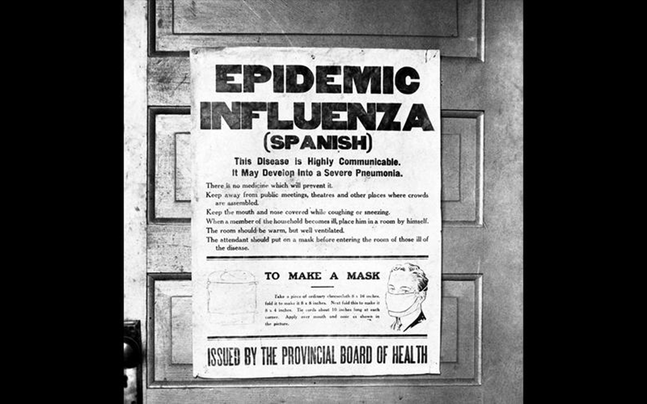 Una fotografía del cartel producido por la Junta de Salud de la Provincia de Alberta alertando al público sobre la epidemia de influenza en 1918. [University of Calgary Press Sept 2016]