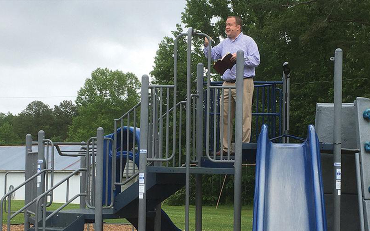 Jason Carlson, pastor de la iglesia Floral Crest en Bryant, Alabama, Estados Unidos, utiliza los juegos de un parque infantil para predicar durante un culto en el estacionamiento de una escuela. [Fotografía: Darrell Wade, Southern Tidings]