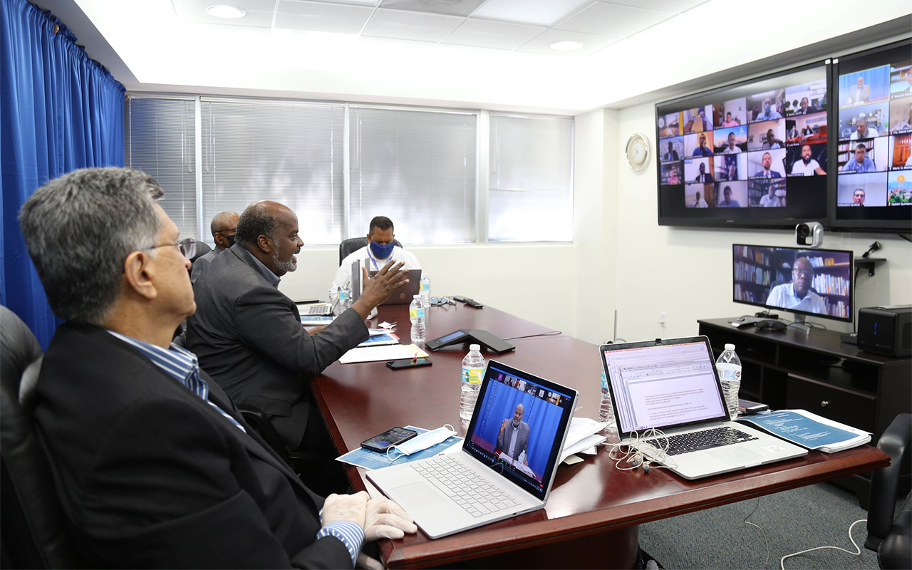 El pastor Elie Henry, presidente de la División Interamericana, se dirige a los administradores de las uniones el 6 de agosto de 2020. [Fotografía: Libna Stevens/DIA]