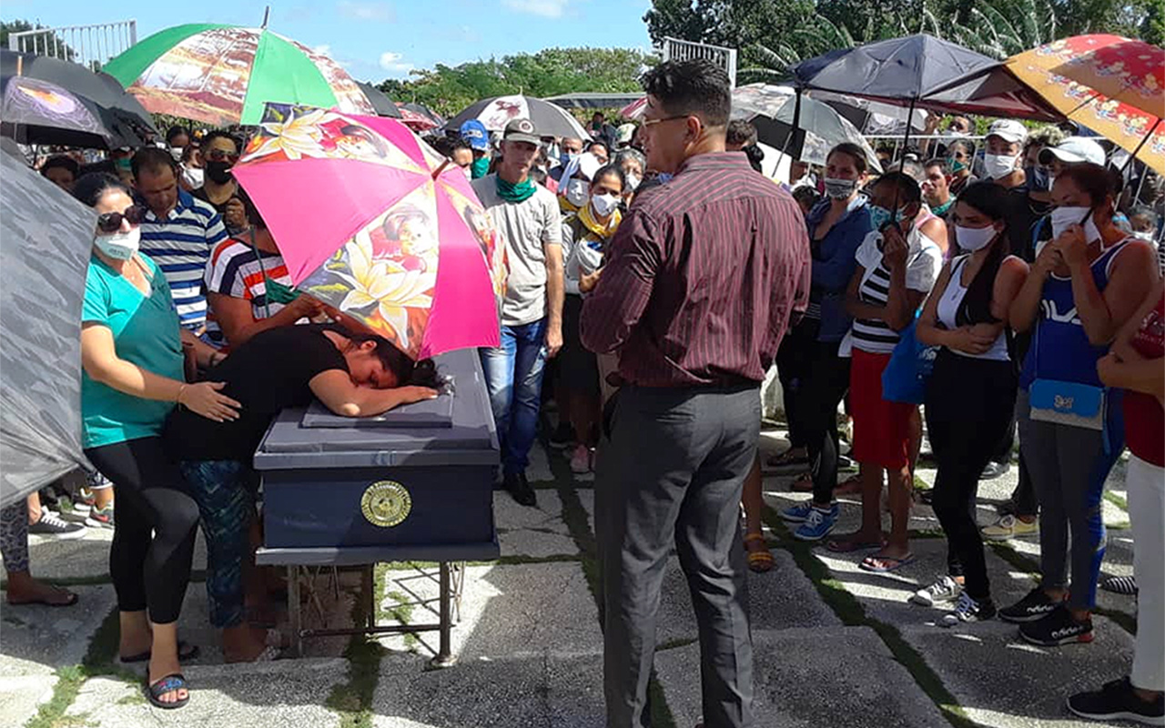 Miembros de la iglesia adventista 10 de octubre en Ranchuelo, Villa Clara, en Cuba, observan mientras los familiares se aferran al cajón en el que yace Kendry Díaz Negrín, ante de que fuera sepultado el pasado 26 de agosto de 2020. Kendry, de 16 años, fue electrocutado por una línea de energía eléctrica caída después de que la tormenta tropical Laura derribó árboles y postes de electricidad, y esparció escombros el pasado 24 de agosto. [Fotografía: Unión Cubana]