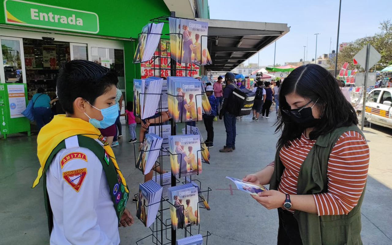 David Emmanuel (izquierda), miembro del Club de Conquistadores Amitai en Comitán, Chiapas, México, armó un puesto de libros para distribuir muestras gratuitas del libro misionero del año del evangelista adventista Mark Finley titulado “Esperanza más allá de la incertidumbre” junto a una entrada a un supermercado. Se distribuyeron más de un millón de ejemplares del libro en el estado el 17 de abril de 2021. [Fotografía: Unión Mexicana de Chiapas]