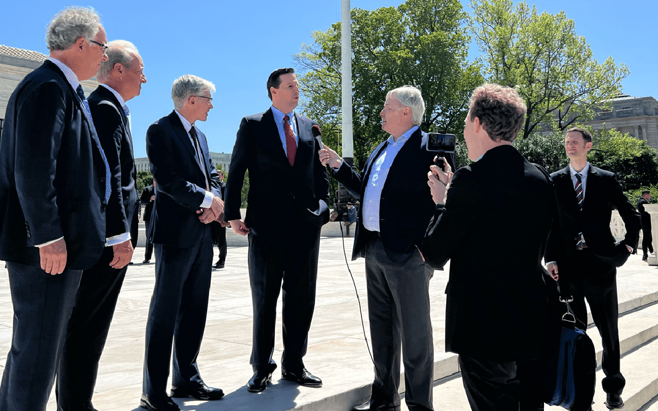 El abogado Aaron Street, de la organización First Liberty, quien presentó el caso ante la Corte Suprema, es entrevistado junto con otros miembros del equipo de Groff después de la audiencia. Alan Reinach, director de Asuntos Públicos y Libertad Religiosa de la Unión Asociación del Pacífico de los Adventistas del Séptimo Día, quien primero llevó el caso de Groff a juicio, se encuentra en la izquierda del grupo. [Fotografía: Todd McFarland]