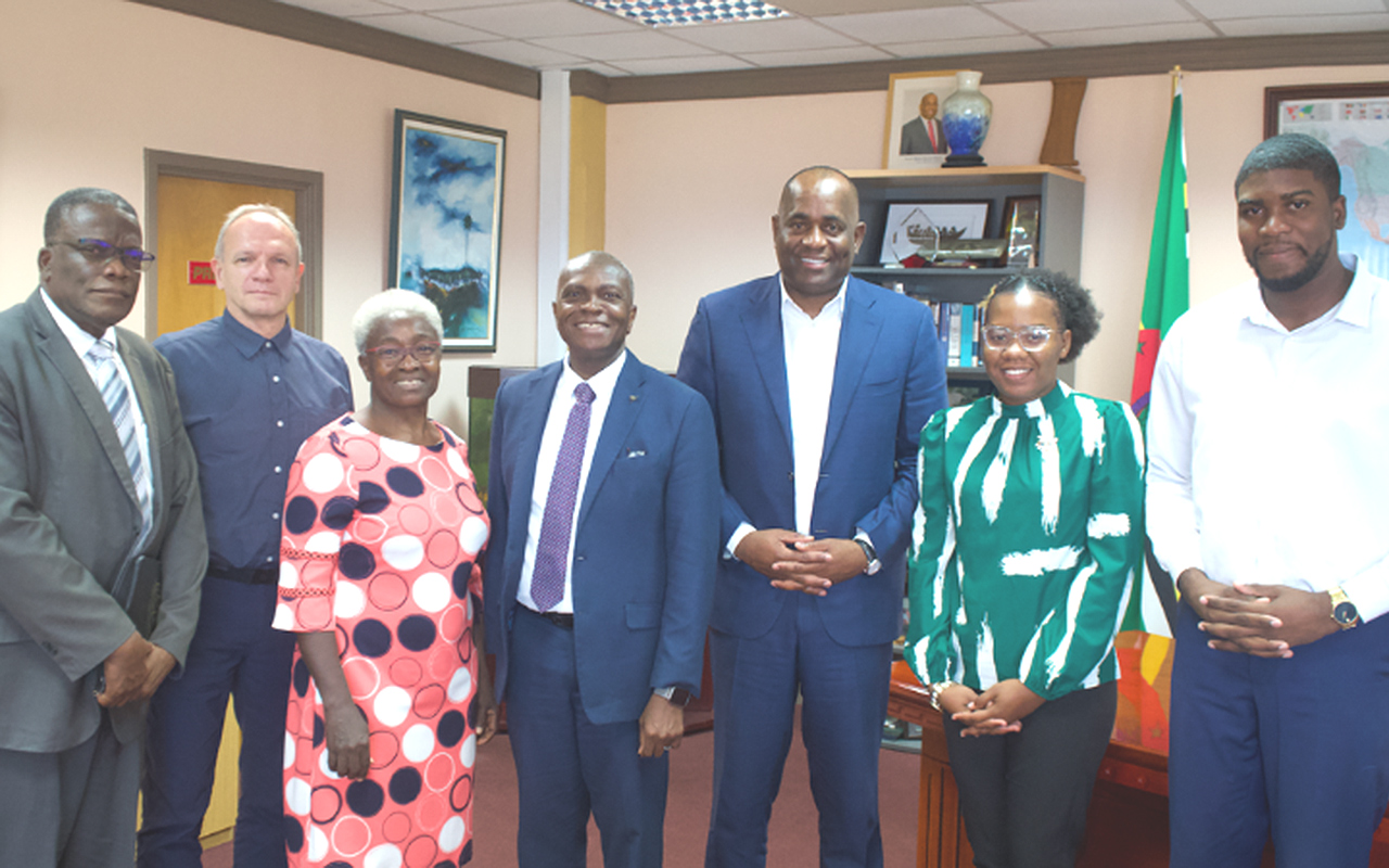 De izquierda a derecha, Alexander Isaacs, director de ADRA de la Unión del Caribe; Bert Smith, gerente general de ADRA Reino Unido; Priscilla Prevost, directora de ADRA en la Asociación del Caribe Oriental; y el pastor Anthony Hall, presidente de la Asociación del Caribe Oriental, posan con el Honorable Roosevelt Skerrit, primer ministro de Dominica, y dos de sus ayudantes. El equipo realizó un llamado de cortesía al primer ministro y visitó hace poco los proyectos de ADRA en la isla de Dominica. [Fotografía: ADRA Dominica]