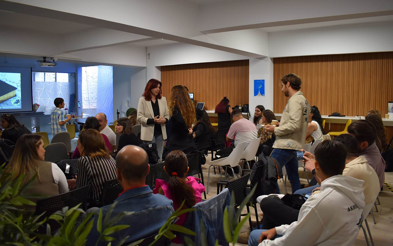 Una miembro joven de Iglesia CERO presenta a Noemí Durán en un salón del centro de Madrid, España, el pasado 20 de mayo [Fotografía: Marcos Paseggi, Adventist Review]