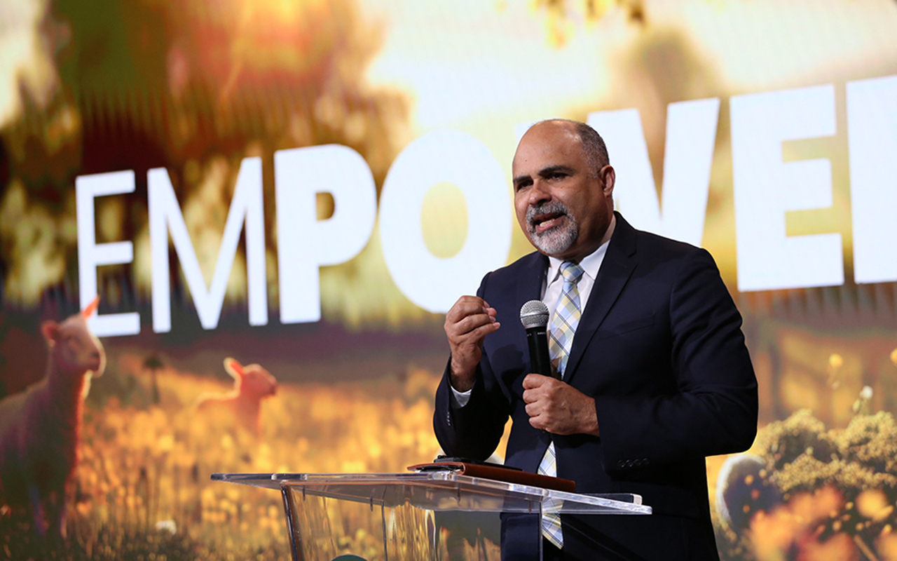 El pastor Josney Rodríguez, secretario ministerial de la División Interamericana, da la bienvenida a miles de usuarios en línea, durante el programa anual de certificación de ancianos de iglesia, el pasado 17 de febrero de 2024, desde Miami, Florida, Estados Unidos. [Fotografía: Libna Stevens/DIA]