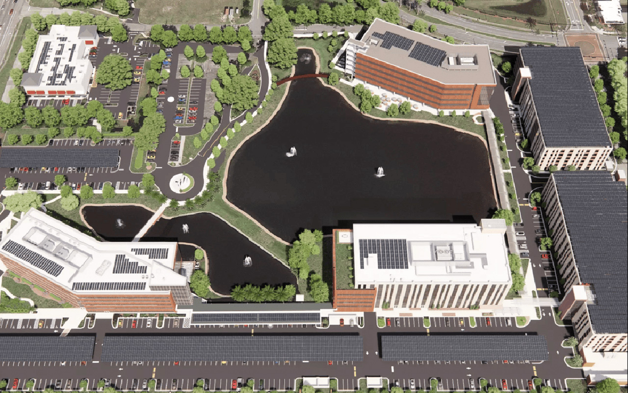 Oficinas corporativas de AdventHealth en Altamonte Springs, Florida, Estados Unidos, con una vista general de su innovador proyecto solar. [Imagen: AdventHealth News]