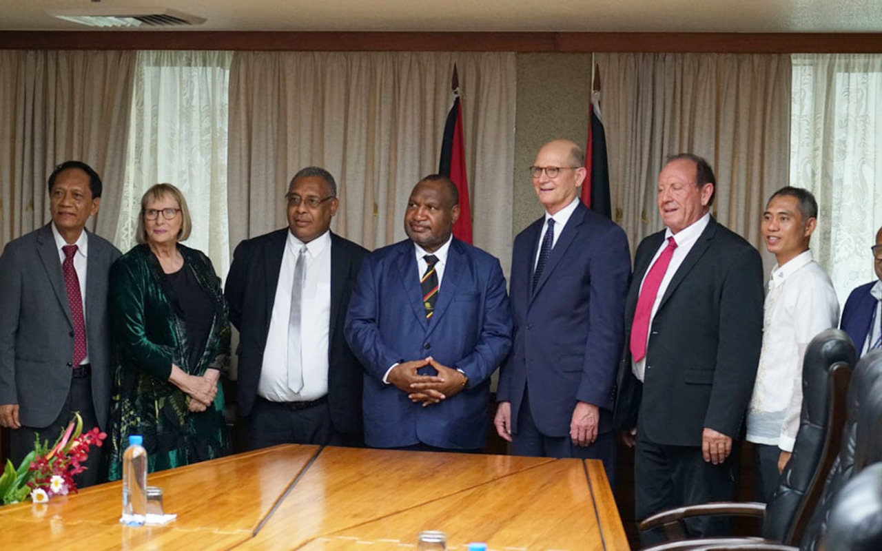 El presidente de la Asociación General, Ted N. C. Wilson (cuarto desde la derecha, se reúne con el primer ministro de Papúa Nueva Guinea (a la derecha del presidente Wilson), en Port Moresby, el 25 de abril. [Imagen: Adventist Record]