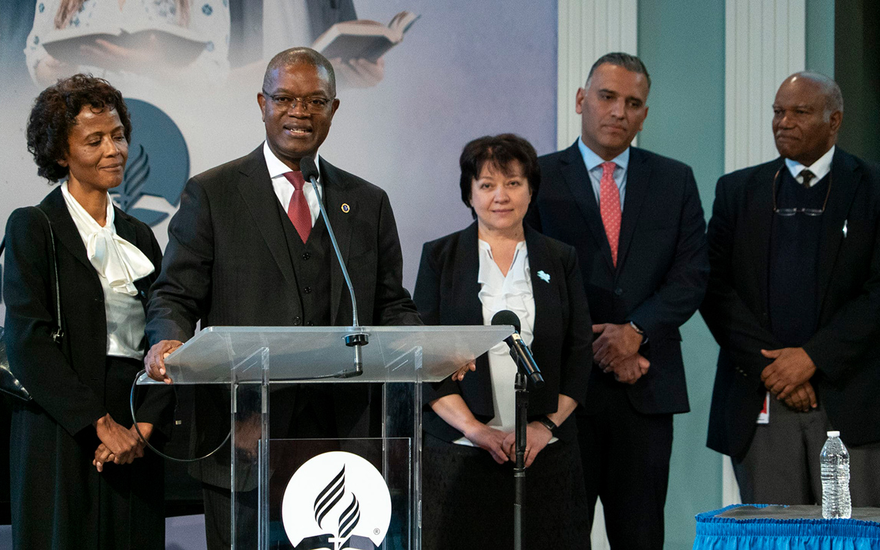 Pierre E. Omeler, nuevo vicepresidente electo de la Asociación General, se dirige a los asistentes durante la Sesión de Primavera, el miércoles 10 de abril. [Imagen: Enno Müller, Adventist Review]