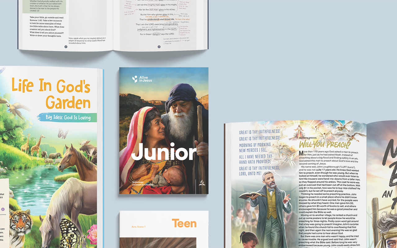 Alive in Jesus (Vivos en Jesús) es distintivamente adventista del séptimo día y muestra que la Biblia es la fuente de verdad y paz en un mundo en constantes cambios. Su enfoque integral en relación con la gracia, el carácter y la misión, hace aumentar el amor por Jesús y su mensaje. Pero Alive in Jesus es también para ustedes, padres, abuelos, encargados de cuidar de los niños y líderes, siendo que creemos que va a fortalecer su ruta con Dios. Ora por favor porque Dios guide la elaboración de este nuevo currículo y ora por los niños en tu iglesia y esfera de influencia. Que verdaderamente nuestros niños vuelvan “a echar raíces por debajo y a dar fruto por arriba” (Isa. 37:31).