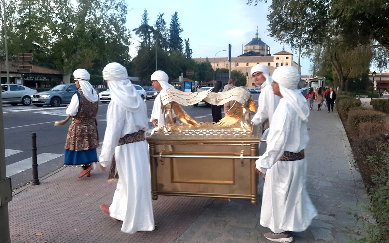 Cuatro hombres vestidos como sacerdotes del tabernáculo del desierto de la Biblia caminan por las calles de Toledo, España, portando una réplica de tamaño real del Arca del Pacto. Los transeúntes se muestran curiosos y se aproximan para observarlos. Muchos comienzan a hacer preguntas.