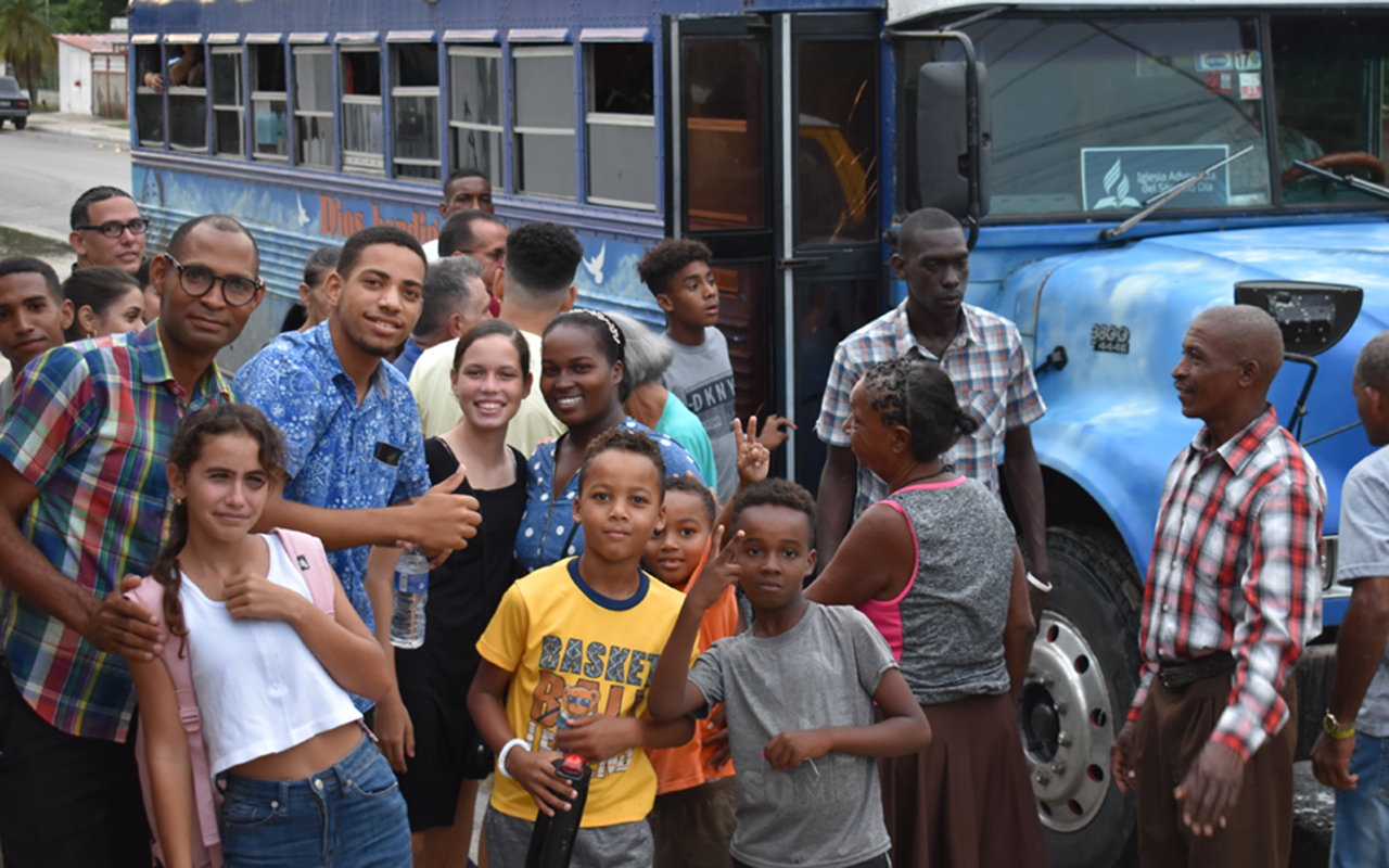 Los miembros de iglesia, sus familias y amigos posan para una fotografía grupal después de salir de un autobús que los llevó hasta la iglesia adventista de Mantilla en La Habana, Cuba, para el culto del sábado. [Fotografía: Marcos Paseggi, Adventist Review]