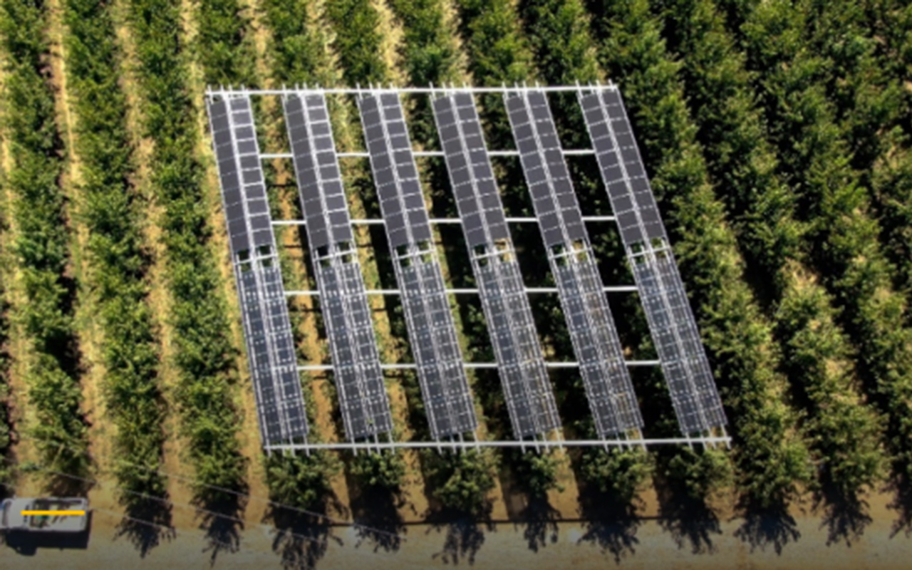 Los paneles fotovoltaicos aumentan la eficiencia del uso del terreno, al combinar producción de energía con producción frutal, con beneficios para ambas cosas. [Imagen: Universidad Adventista de Chile]