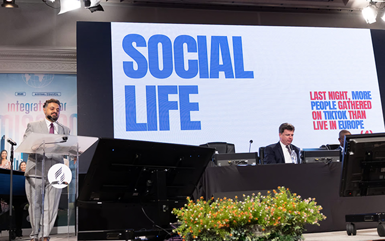 “El tiempo promedio frente a una pantalla en todo el mundo es de siete horas al día, y el promedio de sueño es de 6.5 horas diarias”, señaló. “Anoche hubo más personas reunidas en TikTok que habitantes en toda Europa. La nación no alcanzada más grande vive en el continente digital.”