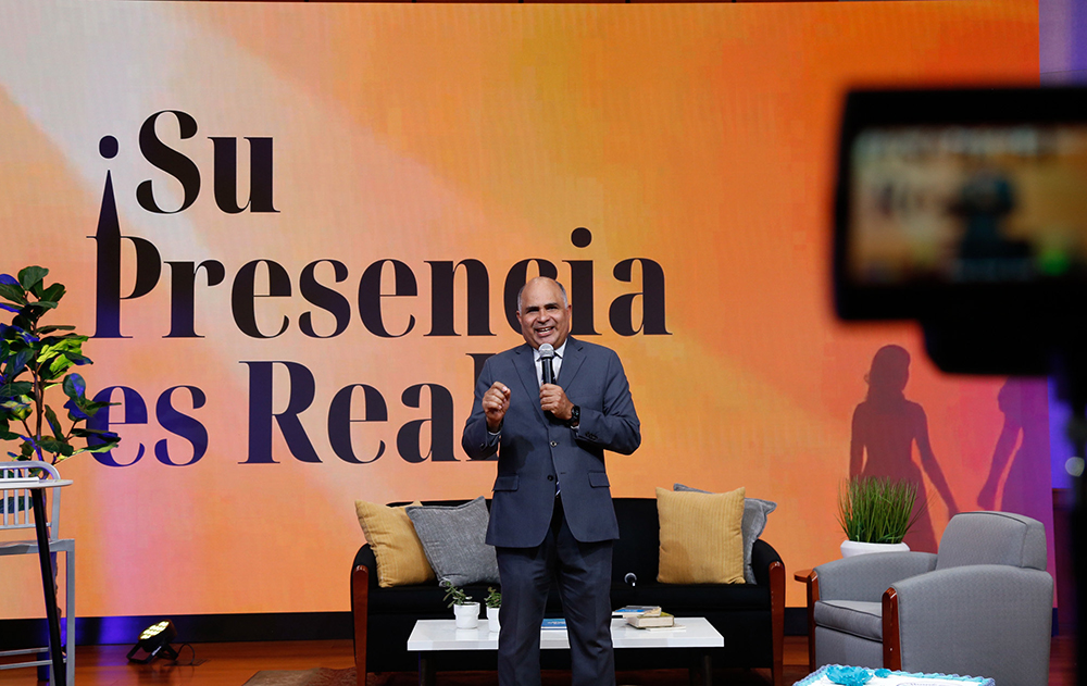 El pastor Abner De los Santos, presidente de la División Interamericana, presenta un mensaje espiritual a los pastores y sus familias en todo el territorio durante la celebración en línea del Programa de Certificación Pastoral el 29 de octubre de 2025. [Fotografía: Libna Stevens/DIA]