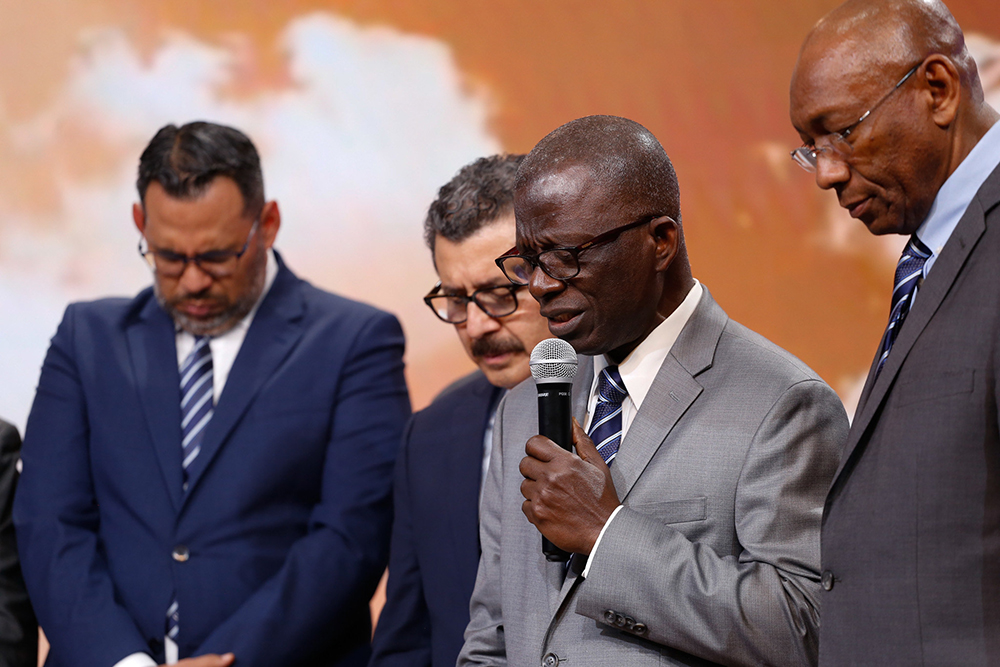 El pastor Pierre Caporal, secretario ejecutivo de la División Interamericana, ora por los líderes de la iglesia durante una sesión especial de oración en el Programa de Certificación Pastoral en línea el 29 de octubre de 2025. [Fotografía: Libna Stevens/DIA]