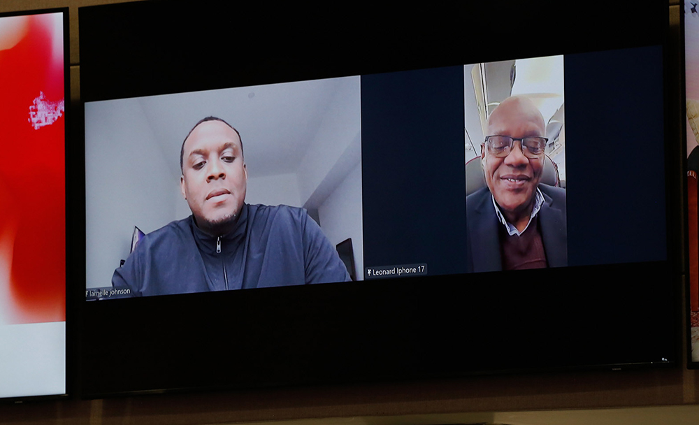 El pastor Leonard Johnson (derecha), exsecretario ejecutivo de la División Interamericana, se une al programa en línea por teléfono mientras su hijo, Larnelle Johnson (izquierda), comparte palabras sinceras sobre el ejemplo cristiano de su padre y su dedicado servicio a la iglesia. [Fotografía: Libna Stevens/DIA]