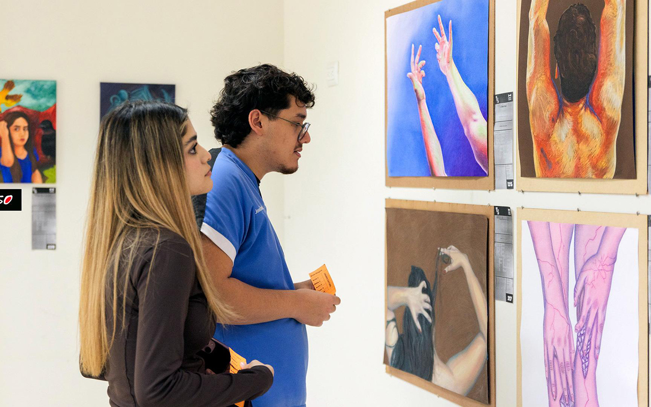 Dos estudiantes observan pinturas durante la Expo ArtCom, en la cual 570 proyectos elaborados por estudiantes en Artes Visuales, Arquitectura, Diseño de Comunicación Visual y Medios de Comunicación, se presentaron en la Universidad Montemorelos, en México. [Imagen: Sebastián Sasso/UM]