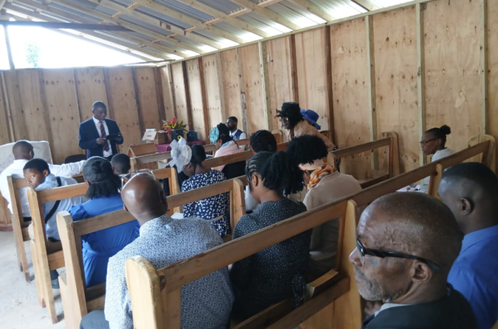 El pastor Karl Archer, ex presidente de la Asociación Norte de Jamaica, adora juntamente con otros miembros el sábado siguiente a la reconstrucción de la iglesia. [Imagen: (Nehemiah Skilled Volunteers Team]