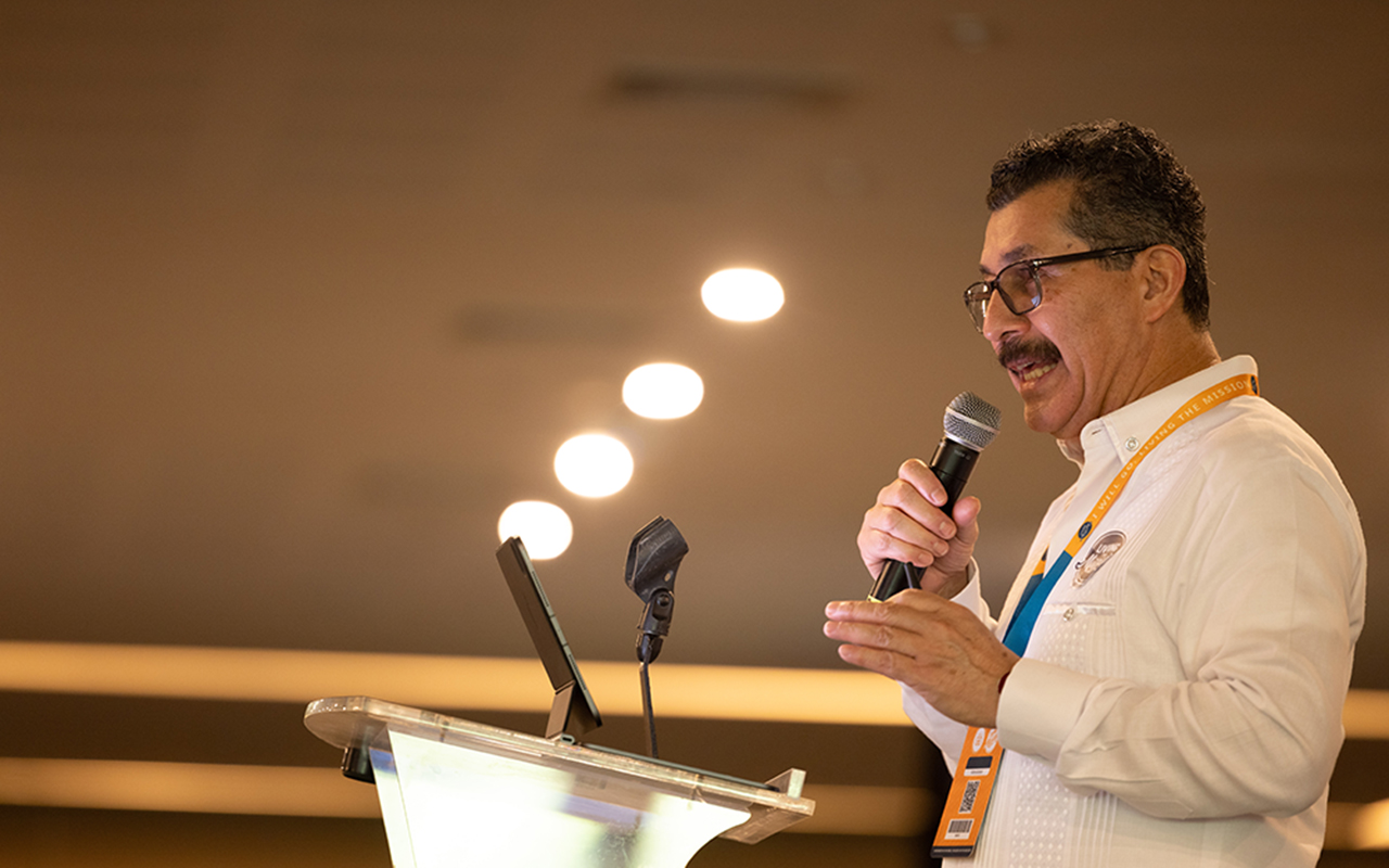 El pastor Abner De los Santos, presidente de la División Interamericana, se dirige a cientos de administradores de iglesias durante la sesión de discusión grupal en la cumbre de liderazgo del 2 de marzo de 2026, en Riviera Maya, México, enfatizando que la estructura tiene que servir a la misión. [Fotografía: Daniel Gallardo/DIA]